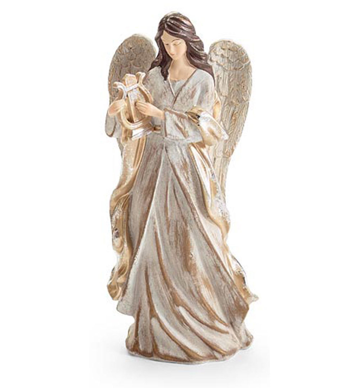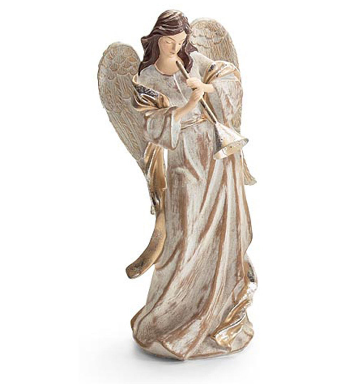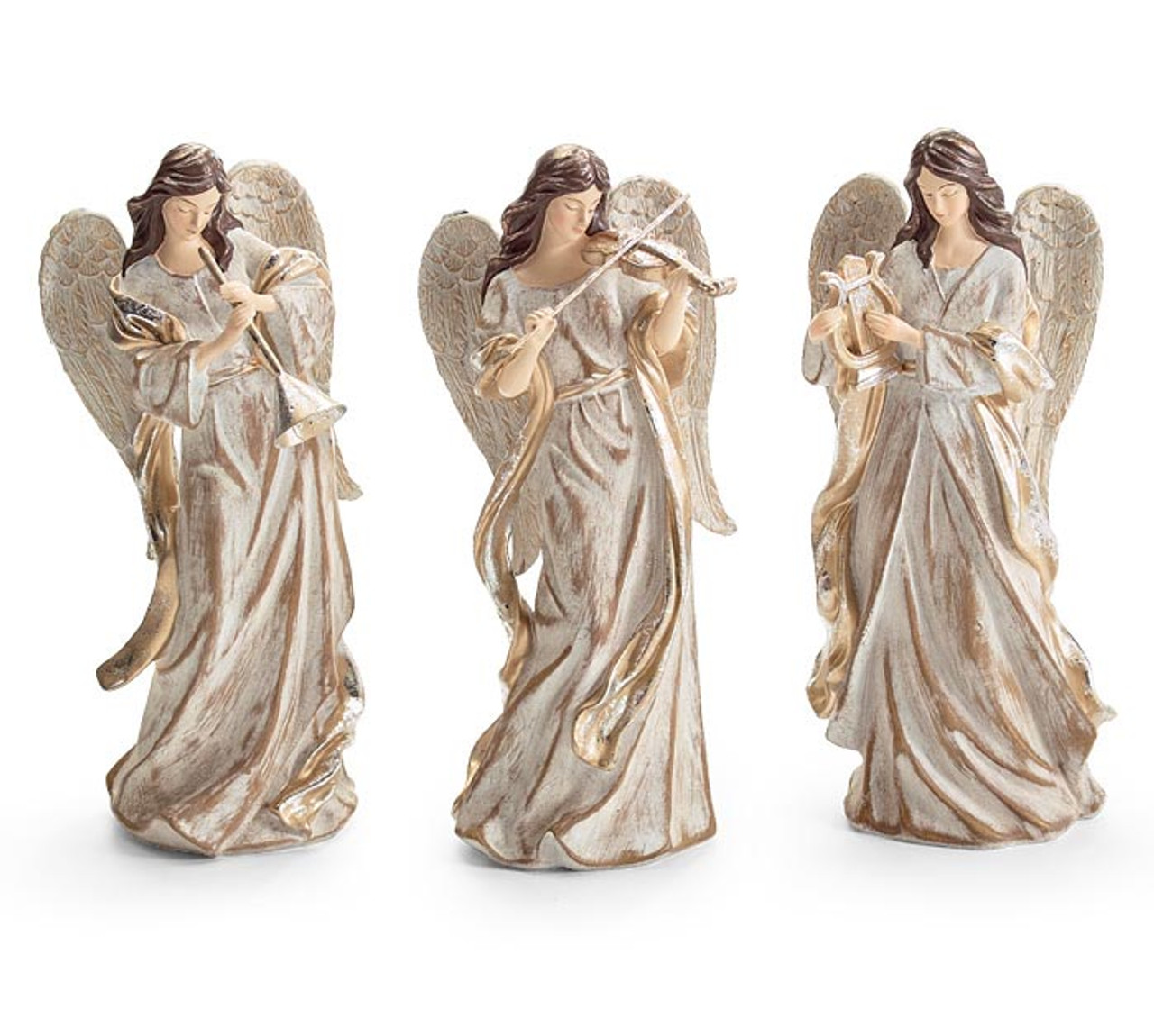 Assortment of angel figurines. Assortment includes 3 angels, with heads tilted down and eyes closed, each holding either a horn, harp, or violin.