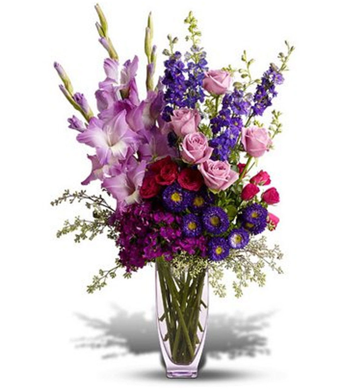 Even someone who is super-sophisticated will be swept away by this incredible array of flowers in a classic lavender glass vase. It's that spectacular! You'll see.