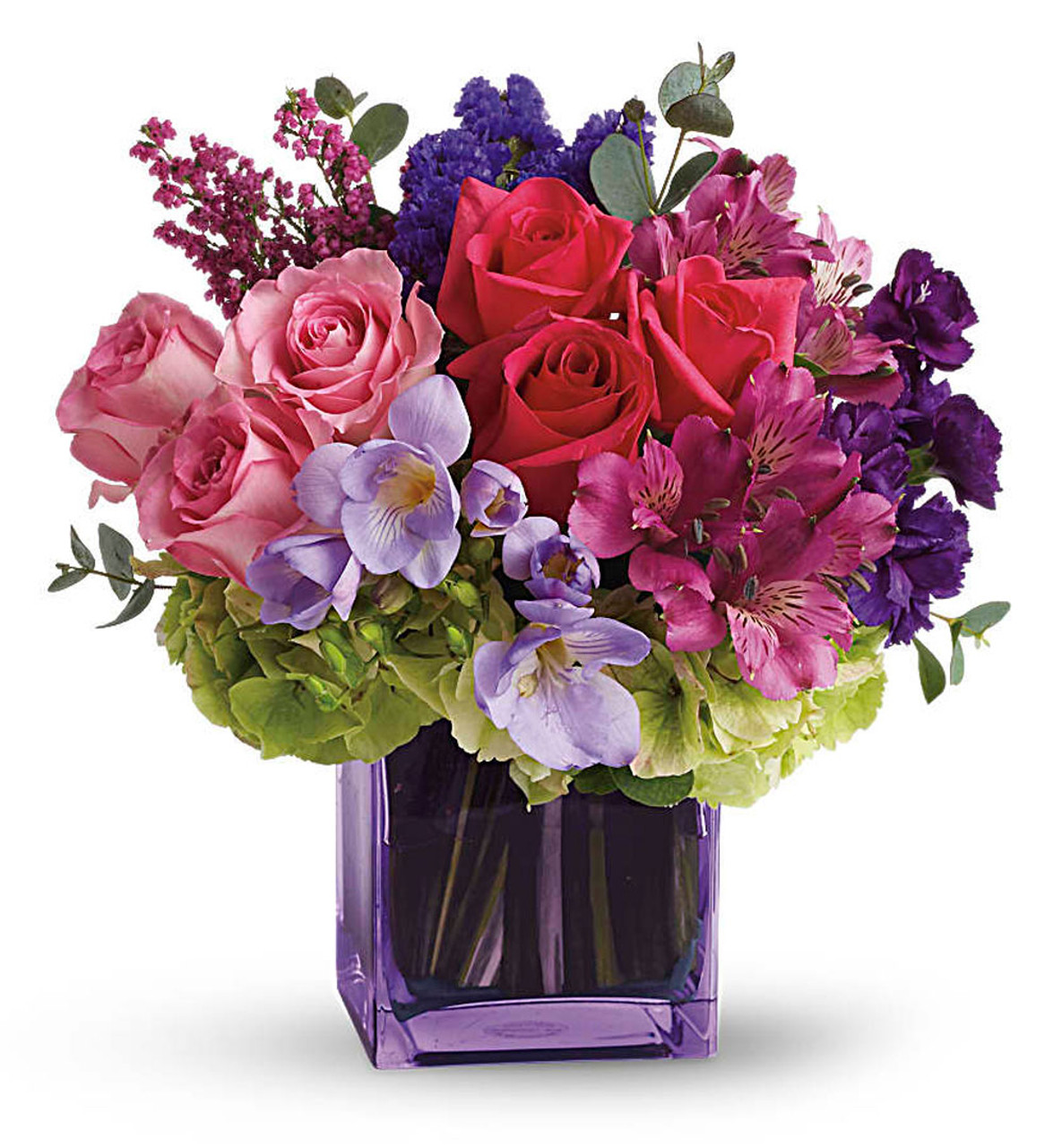 This exquisite mix of feminine blooms is like a breath of fresh air! Sweet pinks and purples are contrasted with a modern burst of fresh green hydrangea, and finished off with a pretty lavender cube vase lined with a tropical aspidistra leaf. It's a fun pick-me-up to send anytime, anywhere!