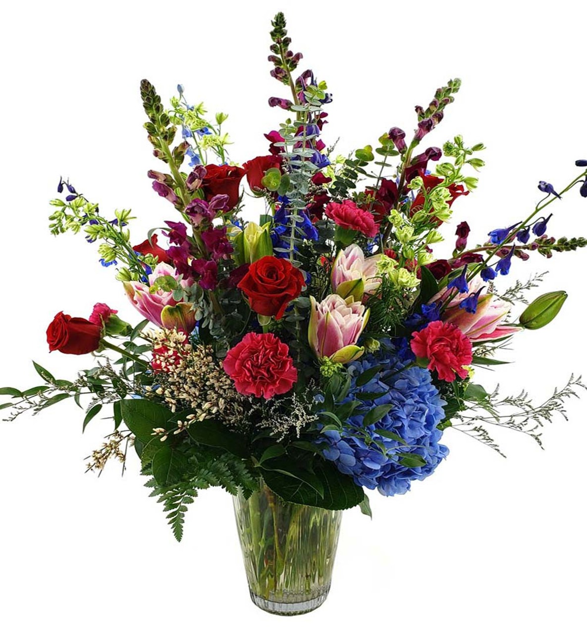 - Includes: blue hydrangea, red roses, burgundy snapdragons, white larkspur, hot pink carnations, Stargazer lilies, royal blue belladonna, caspia, ginestra, Italian ruscus, & spiral eucalyptus