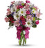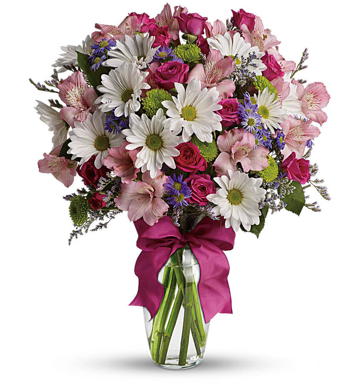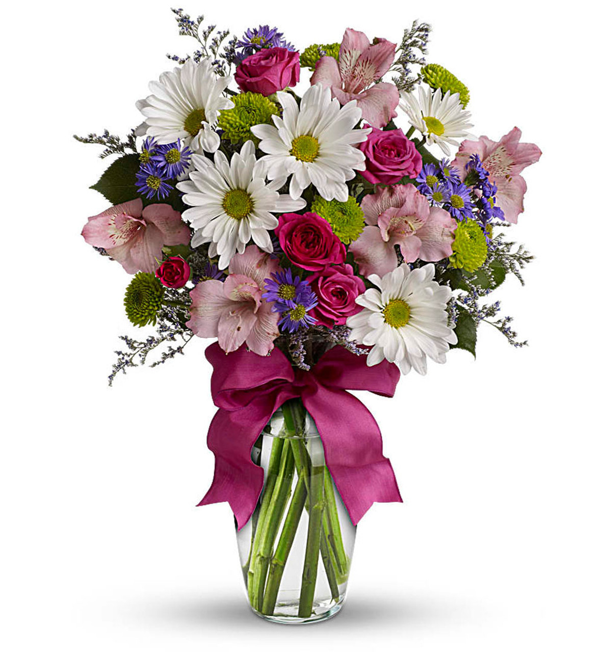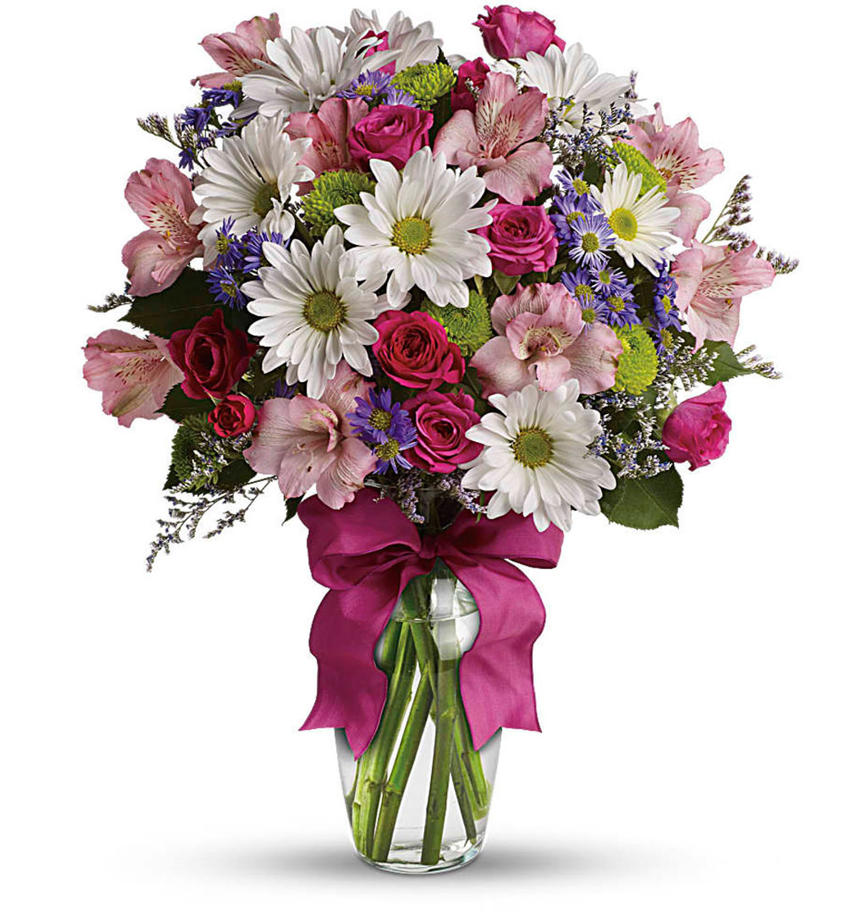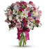 - A mix of fresh flowers such as spray roses, daisy and button spray chrysanthemums, Monte Cassino asters and limonium, in shades of white, pink, green, purple and lavender.