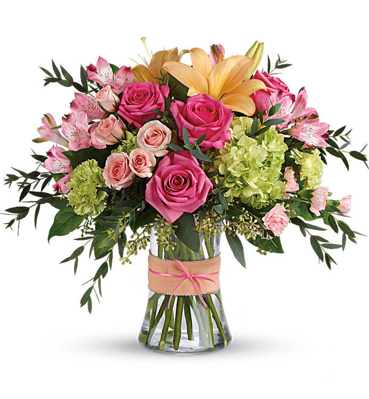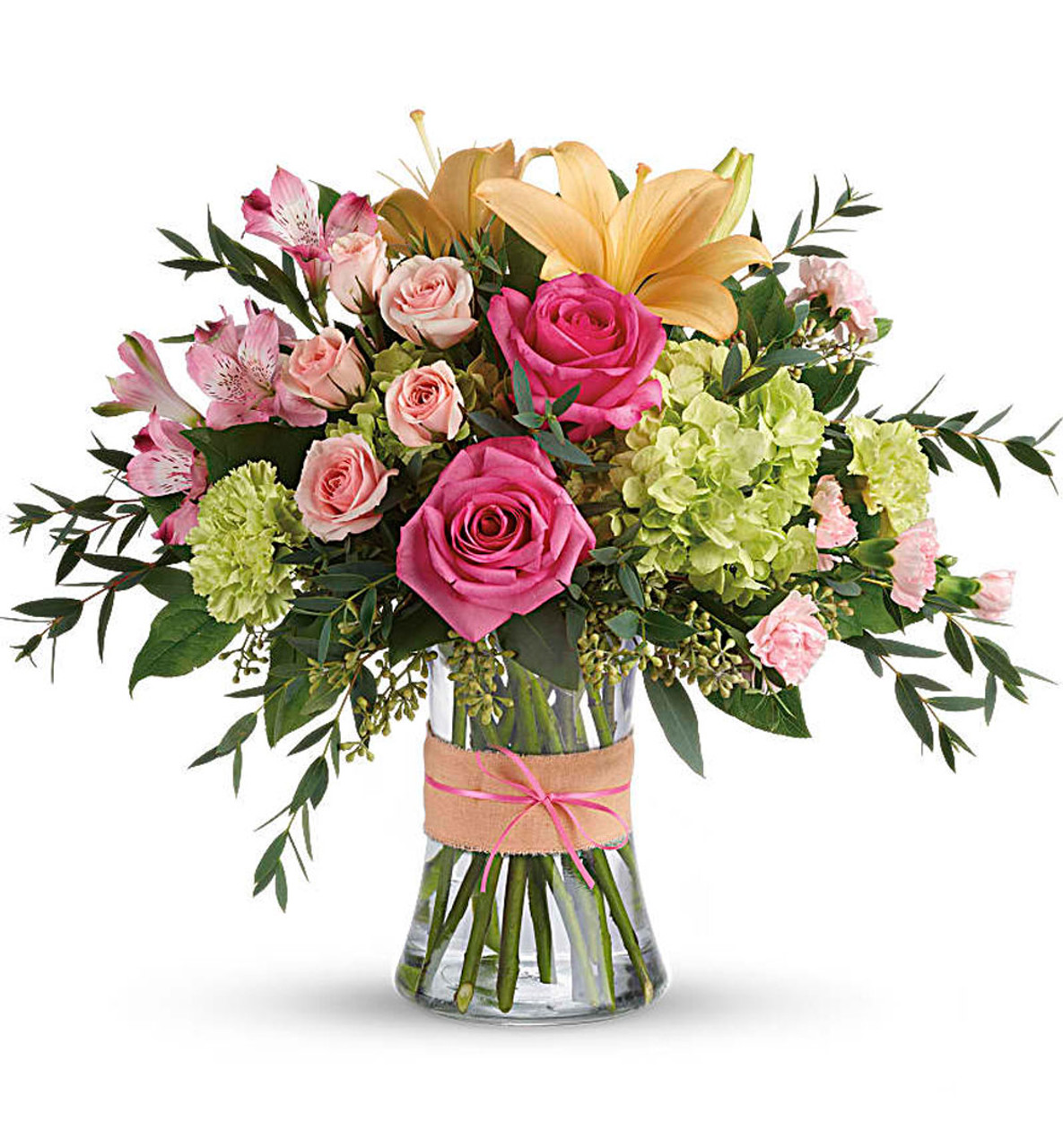 - This sweet arrangement features green hydrangea, hot pink roses, pink spray roses, peach asiatic lilies, pink alstroemeria, green carnations, pink miniature carnations, seeded eucalyptus, parvifolia eucalyptus, and lemon leaf.