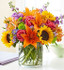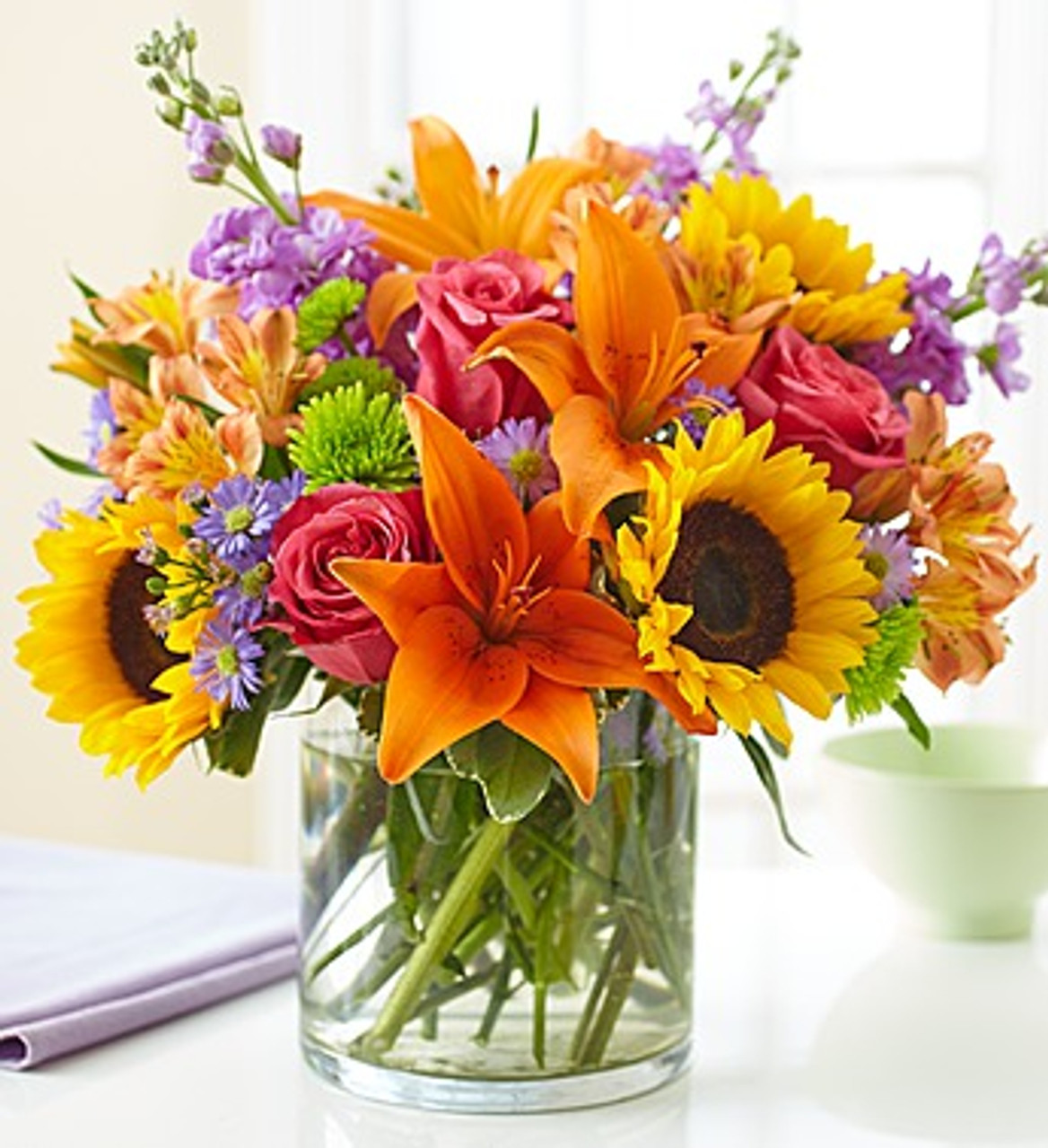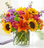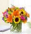 - Vibrant arrangement of roses, lilies, sunflowers, stock, alstroemeria, poms and monte casino, gathered with fresh salal