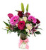 - Artistically designed in a clear glass vase accented with a pink satin ribbon; measures 8"H