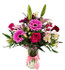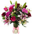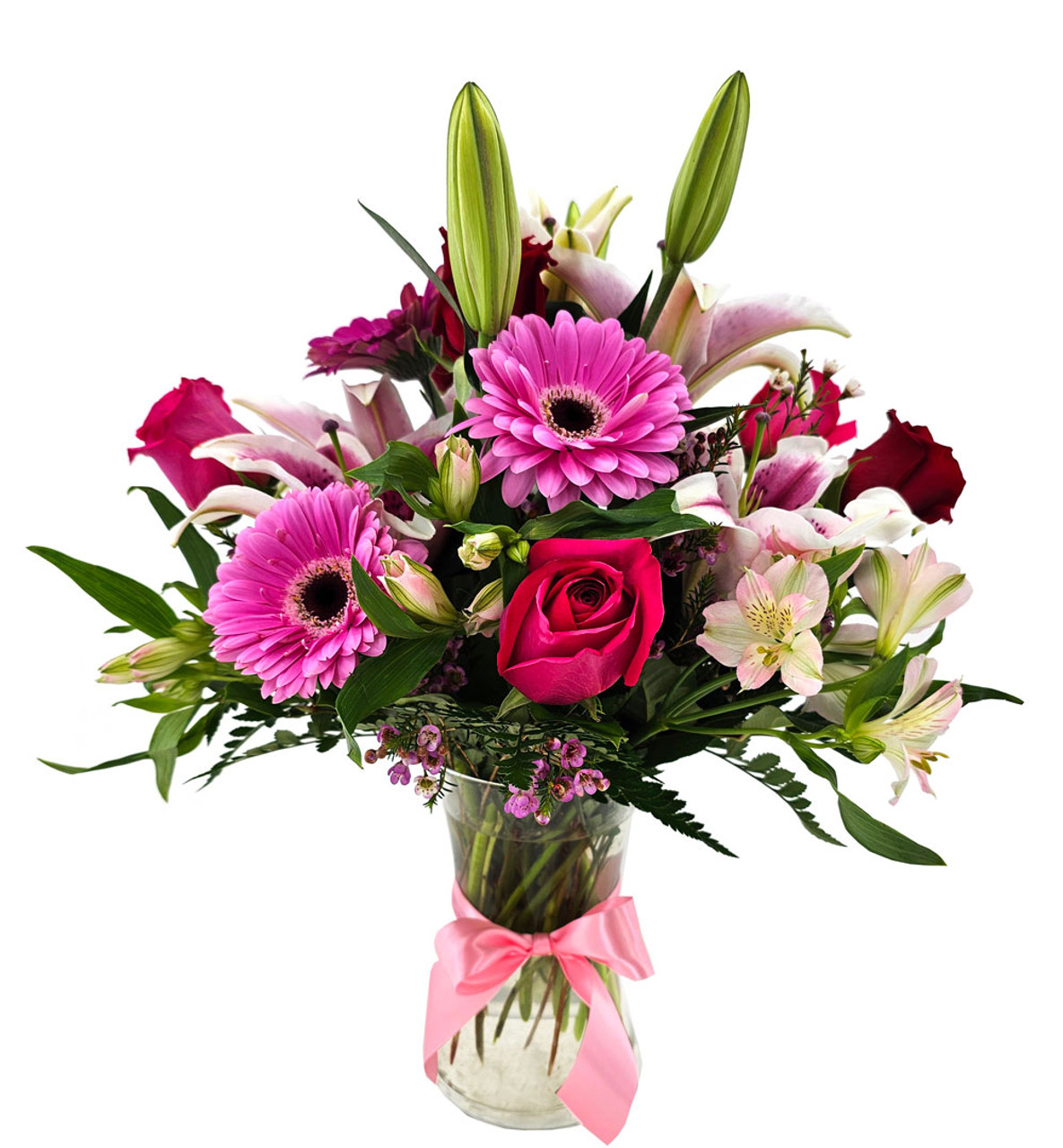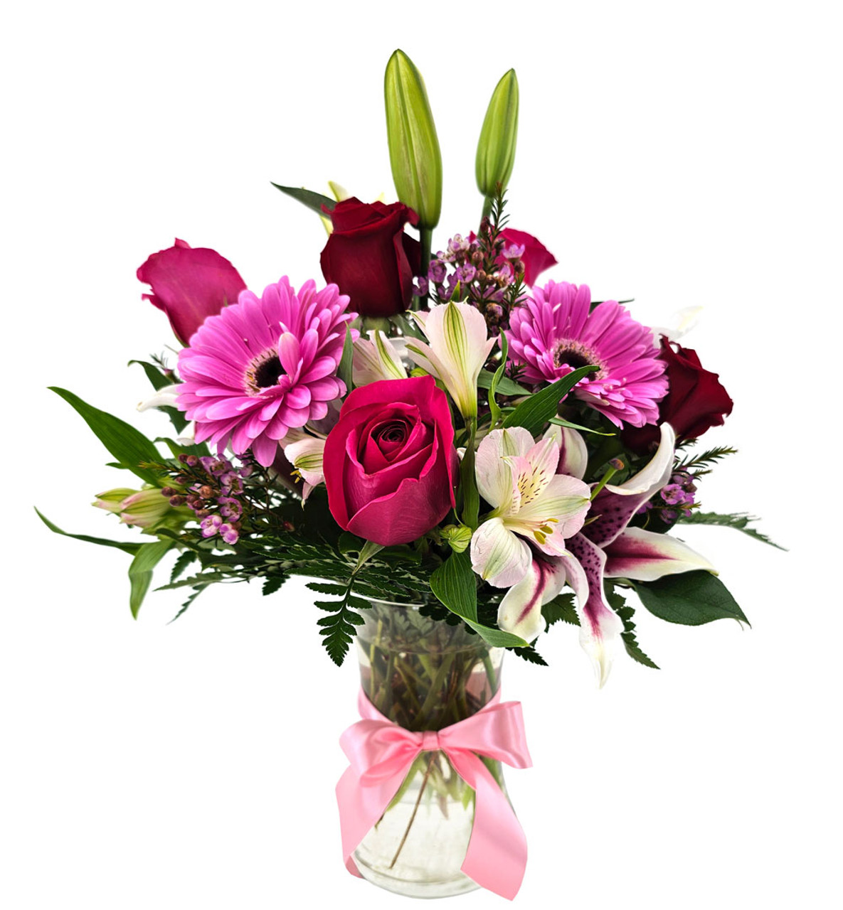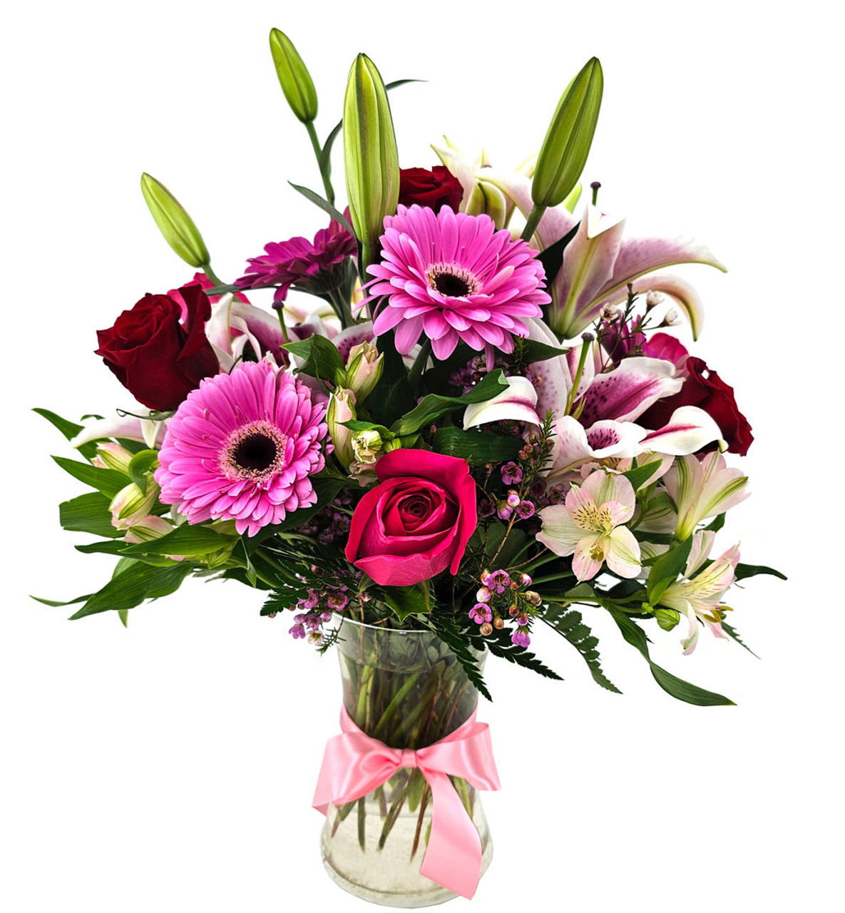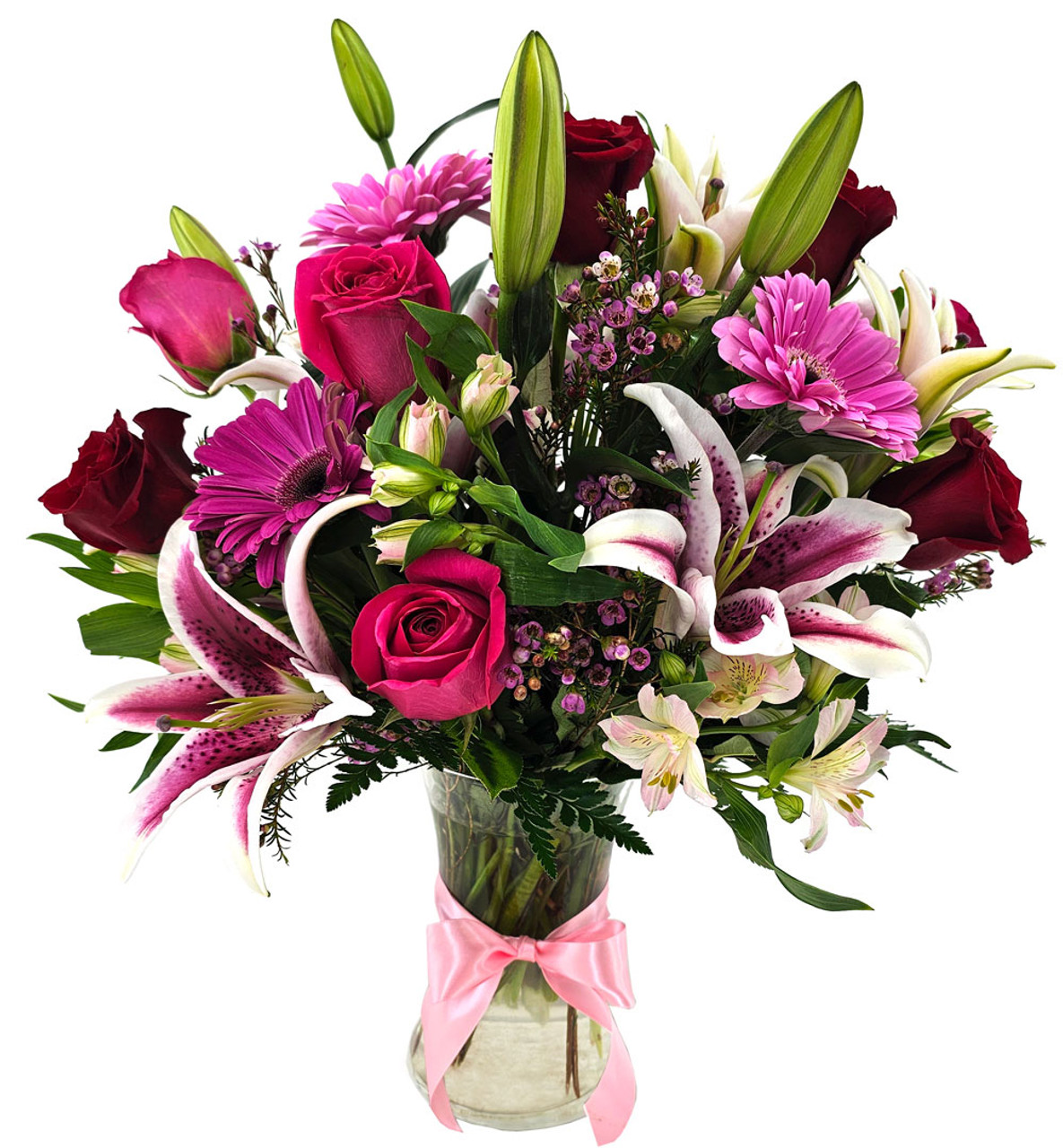 "Love and Romance" Bouquet is a meticulously crafted floral arrangement designed to express deep love and passion. Featuring a mix of red and hot pink roses, stargazer lilies, pink gerbera daisies, pink alstroemeria, and purple waxflower, it combines beauty and fragrance in one stunning package. Presented in a clear glass vase with a pink satin ribbon, it's the perfect gift to ignite romance, celebrate anniversaries, or declare your affection for someone special.
