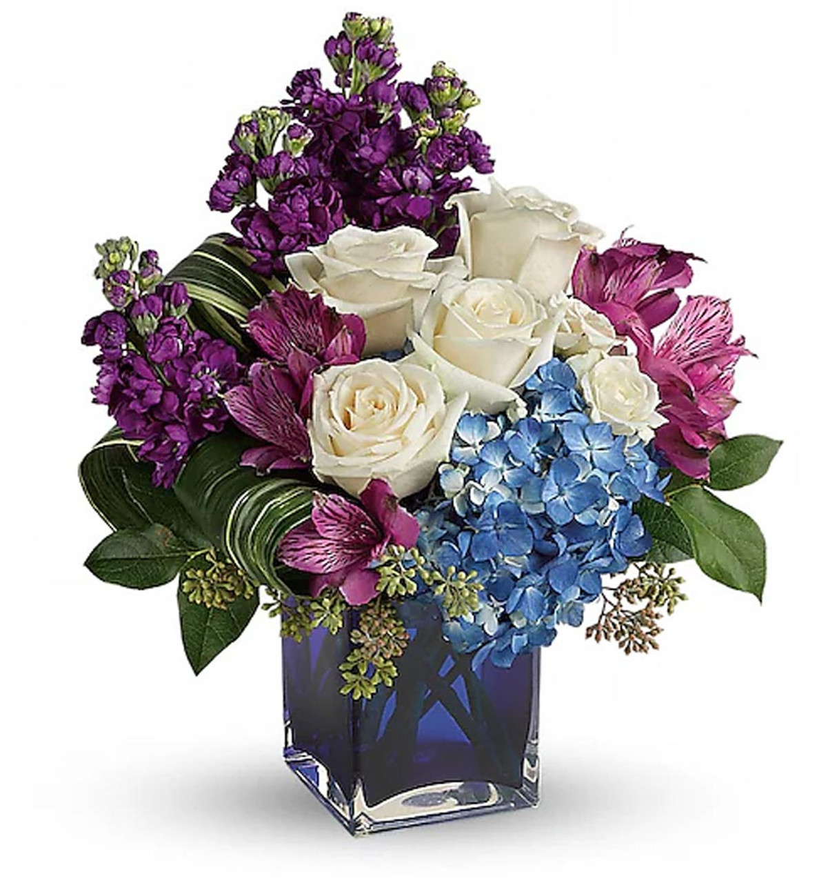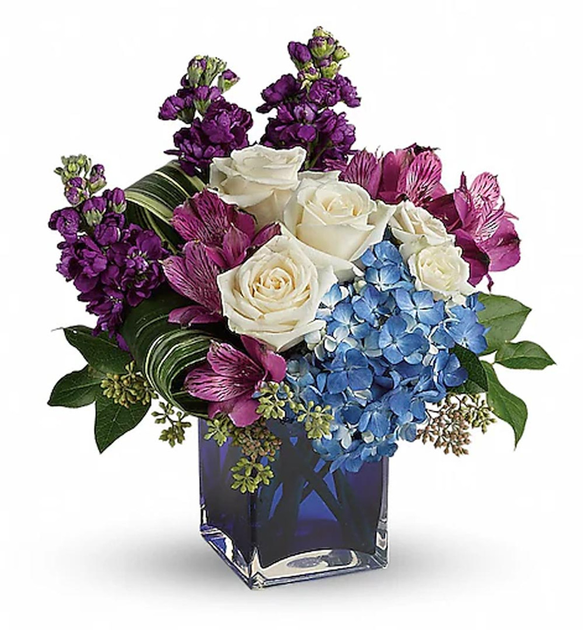 - Blue hydrangea, crème roses, white spray roses, purple alstroemeria and purple stock are arranged with lemon leaf and variegated aspidistra leaves. Delivered in a blue cube vase.