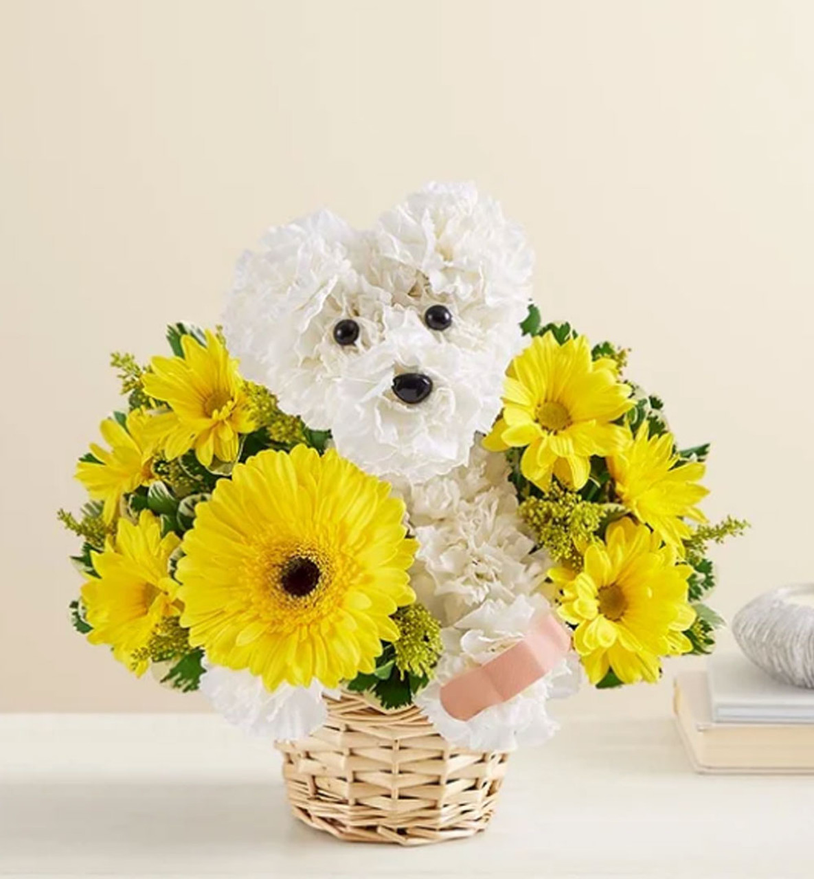 Our truly original flower pup is the best pick-me-up for anyone under the weather. Handcrafted with white blooms and yellow accents, this adorable creation will have them on the mend in no time. Add a colorful Get Well balloon for happy healing wishes.