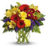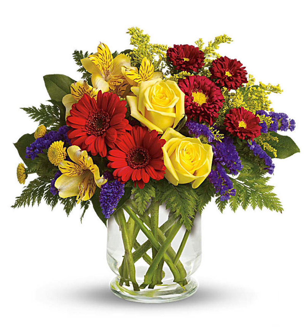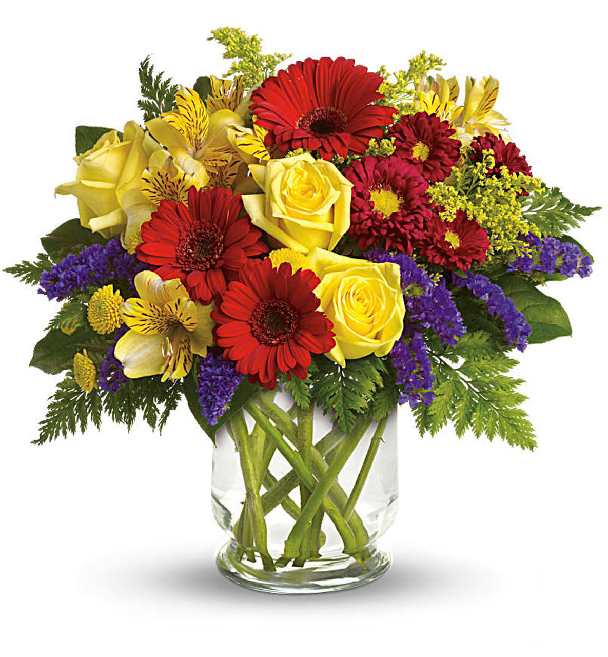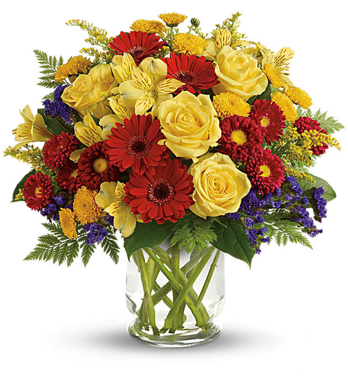 - Shades of red, yellow, purple and green are represented in miniature gerberas, roses, alstroemeria, matsumoto asters, button mums, statice, solidago, leatherleaf fern and salal.