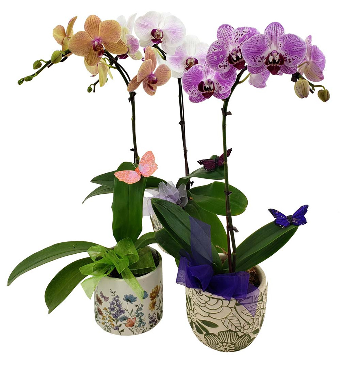 Random assorted colors of single-stem Phalaenopsis Orchids in a decorative ceramic container.  Orchid and planter color may vary from pictured.  Price is for a single plant.