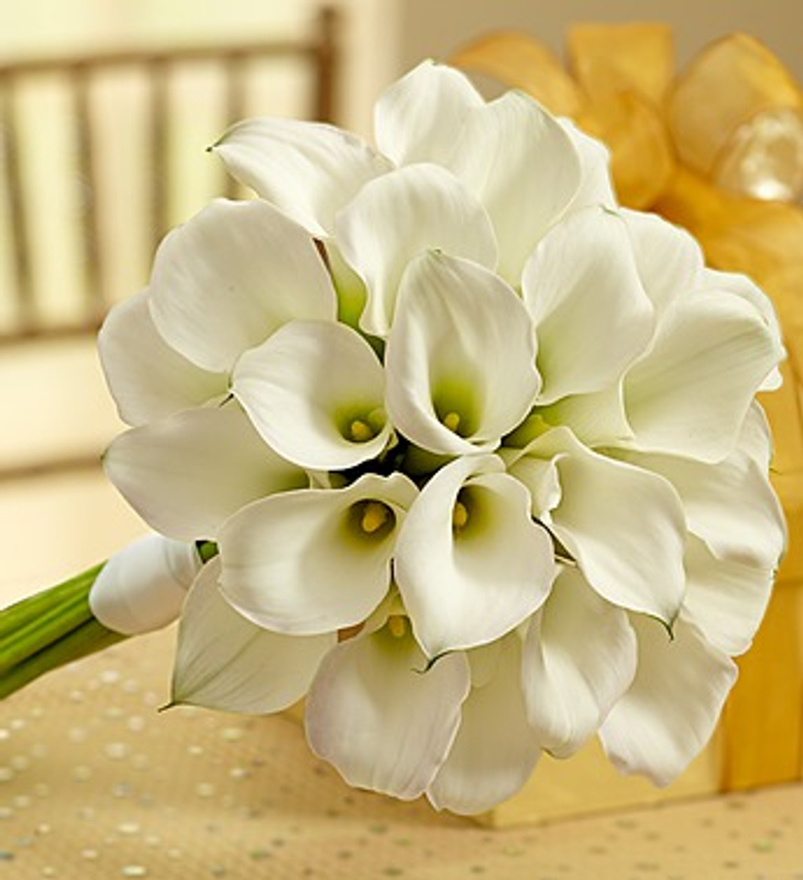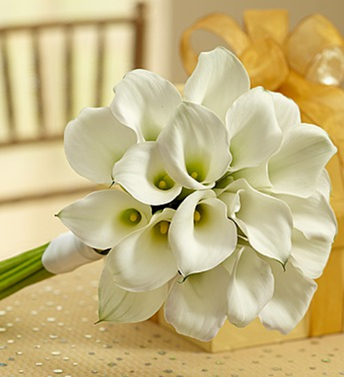 • Stunning, hand-designed bouquet of white miniature Calla lilies accented with a crisp white satin ribbon