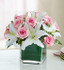 Contemporary elegance meets classic style with this stunning bouquet. Gorgeous fresh pink roses share the stage with showy white lilies, hand-designed and arranged by our select florists in a compact style. Then, this dynamic duo is gathered in a chic cube vase lined with exotic Ti leaf ribbon.