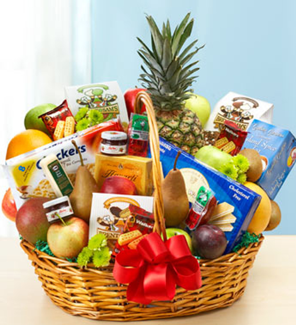- Hand-packed basket includes a deluxe assortment of orchard-fresh fruit and gourmet snacks, selected by our expert florists and accented with fresh poms