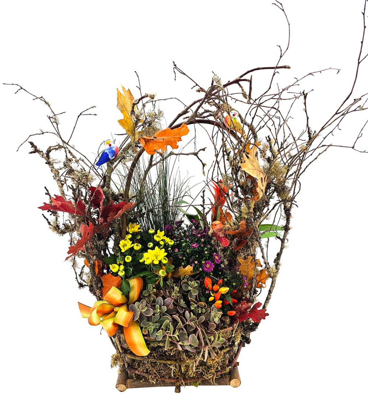 Immerse yourself in the evocative essence of the changing seasons with this commanding tall planter, meticulously crafted from authentic, lichen-draped branches that whisper tales of nature's rhythms. Standing as a testament to the beauty of organic, raw elements, its tall structure serves as the canvas for a captivating ensemble of plant life. Succulents lay a textured foundation, ornamental peppers blaze with autumnal fervor, bromeliads provide tropical contrast, and radiant yellow chrysanthemums and purple asters dance amidst wild grasses and nostalgic fall leaves. Perched subtly within this lush green display, three whimsical birds serenade with silent songs of the serene countryside, making this planter not just a decorative piece but a living, breathing tapestry of life.