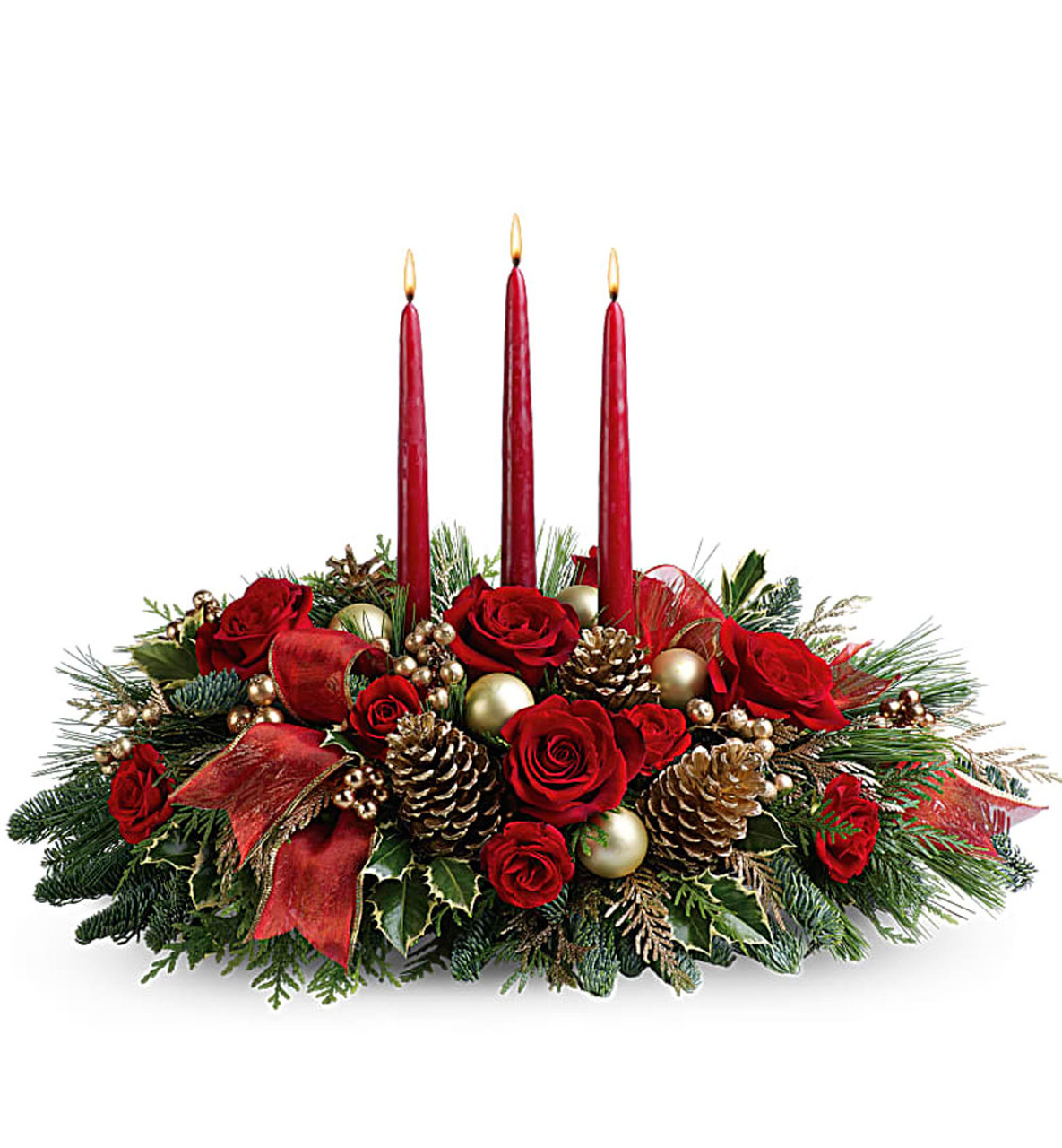 - A fresh centerpiece of holly, noble fir, white pine, flat cedar, roses and spray roses is decorated with golden berries, Christmas ornaments, pinecones and three red taper candles.