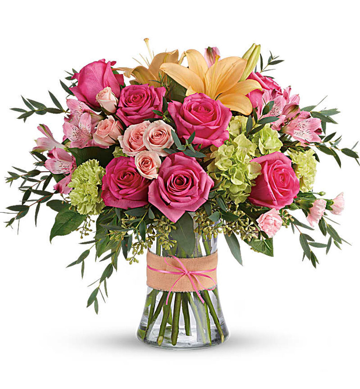 - This sweet arrangement features green hydrangea, hot pink roses, pink spray roses, peach asiatic lilies, pink alstroemeria, green carnations, pink miniature carnations, seeded eucalyptus, parvifolia eucalyptus, and lemon leaf.