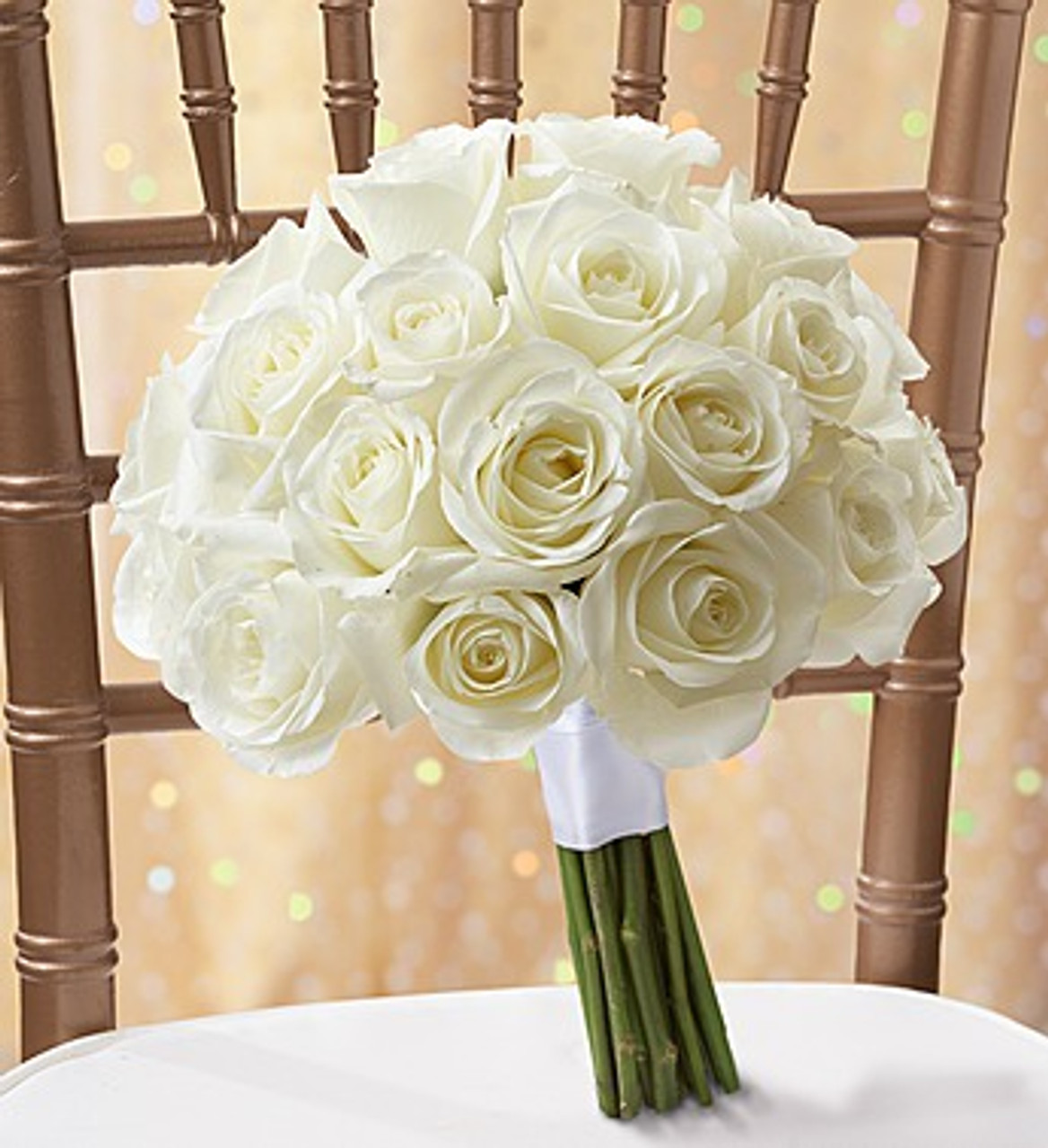 - Stunning, hand-designed bouquet of white roses accented with a crisp white satin ribbon