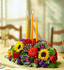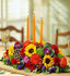EXCLUSIVE One of our most impressive fall bouquets has been re-designed as a luxurious centerpiece. Vibrant red and orange roses, brilliant sunflowers and rich purple statice are gathered with unique accents and topped with a trio of orange candles to turn any autumn get-together into a "grand" celebration!