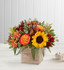 - All-around arrangement with red button poms, leucadendron and hypericum, autum-colored roses, sunflowers, bronze daisy poms; accented with solidago and assorted greenery