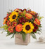EXCLUSIVE The color and charm of an autumn country harvest inspired our new farmhouse-style bouquet. A loose, natural gathering of blooms in vibrant shades of red, orange and yellow creates the perfect complement to our rustic, grey washed wooden cube. With its soft tones and natural textures, it’s an ideal container for flowers and plants, adding warm and coziness to any fall décor.